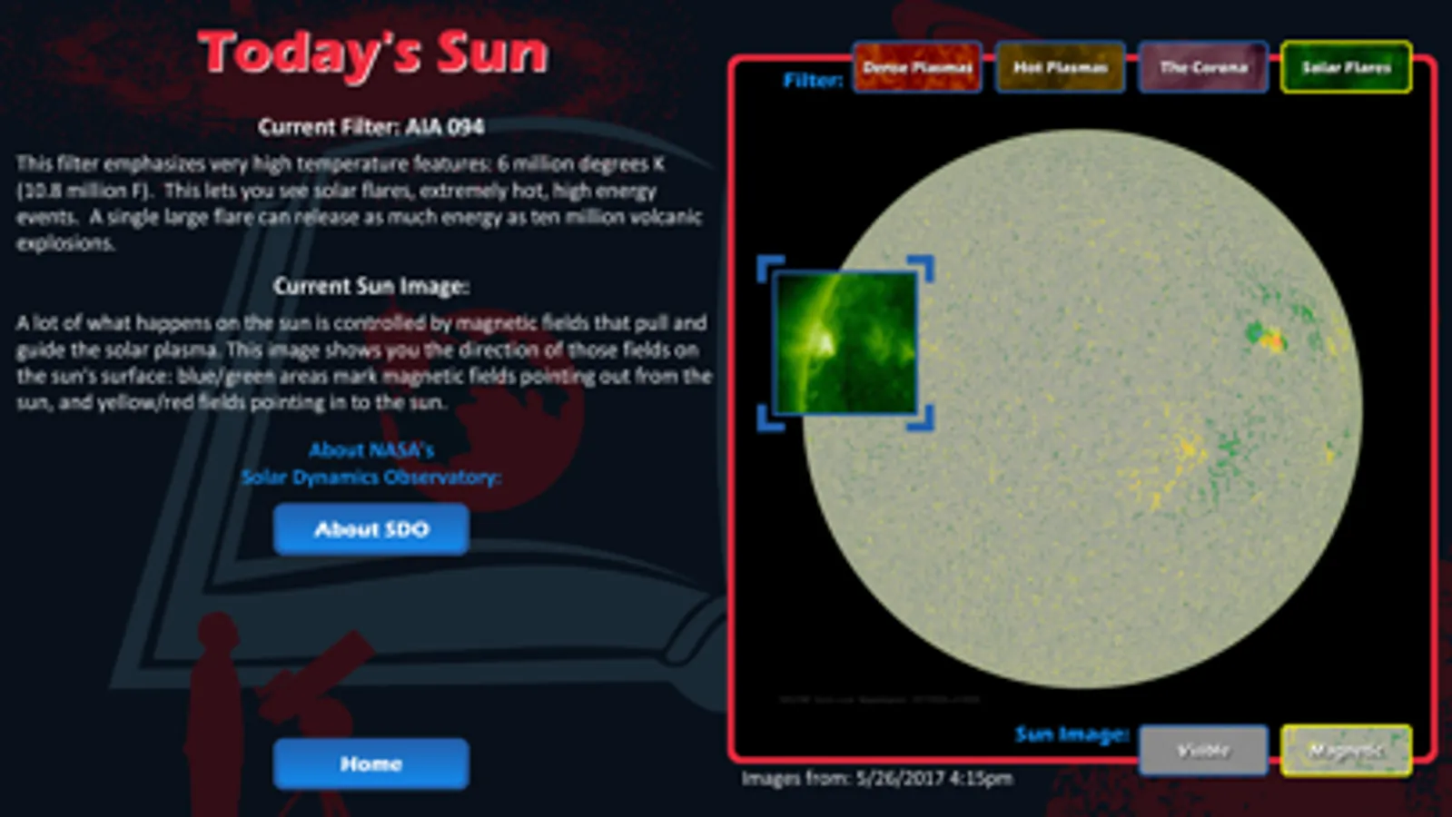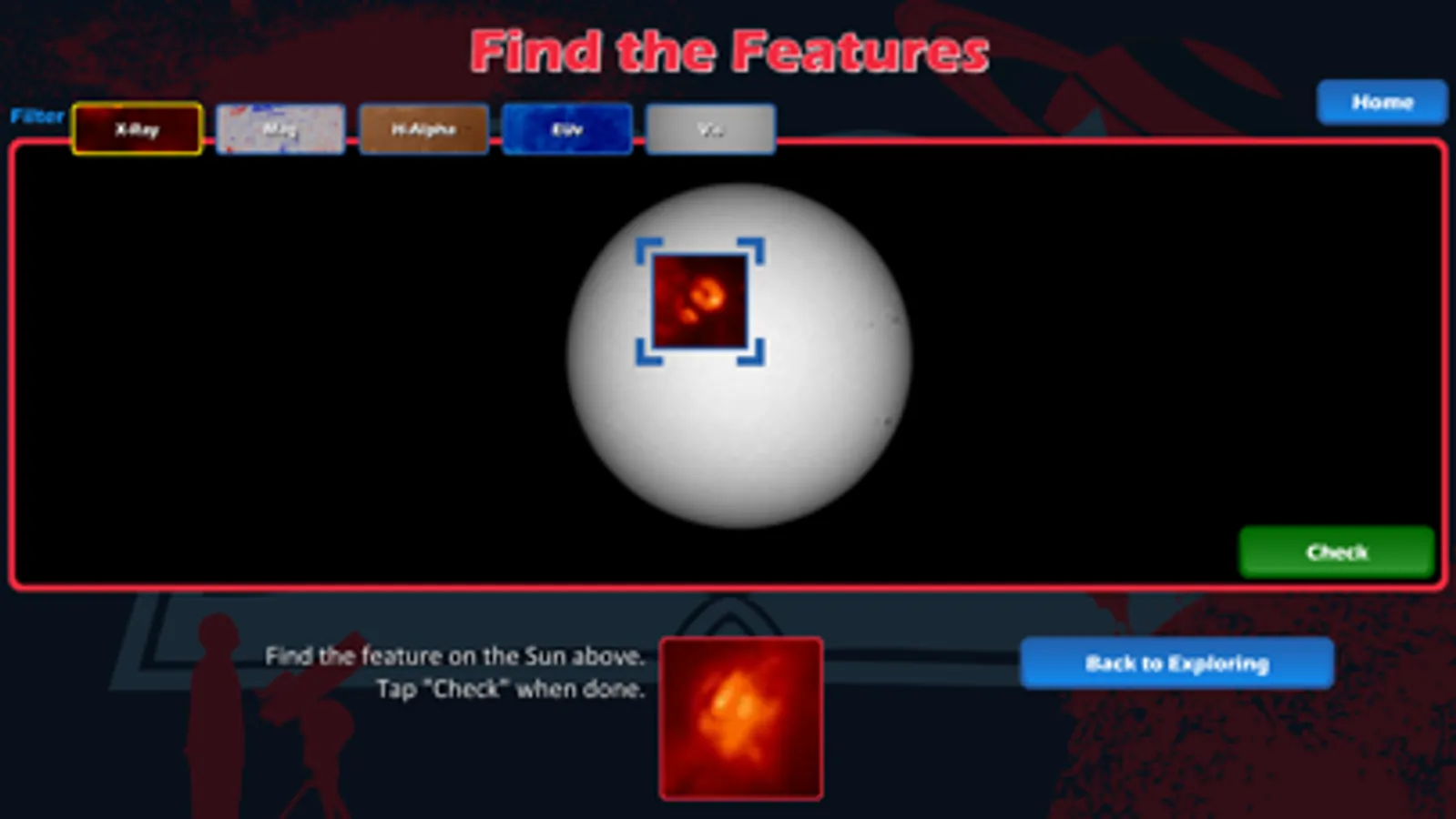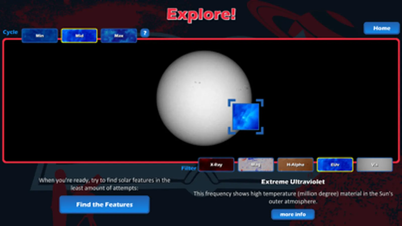 • Filters: explore the Sun in different wavelengths. This includes a challenge mode where you’re asked to find various features on the Sun (sunspots, active regions, magnetic field structures, etc.)