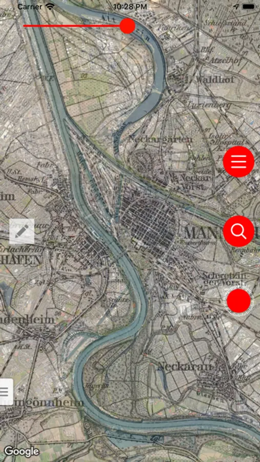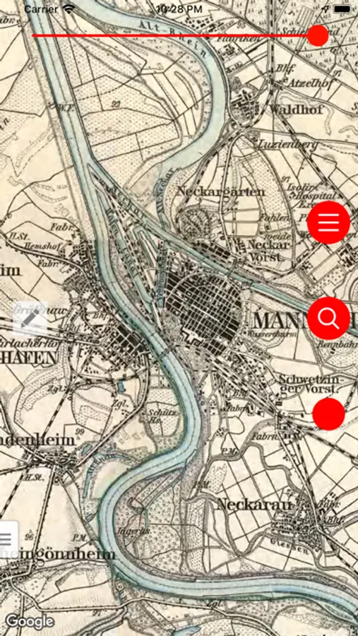 Alte Karten sind immer offline verfügbar, für Satellitenkarten ist eine Internetverbindung erforderlich. Die Markerinstallation erfolgt durch langes Drücken auf die Karte