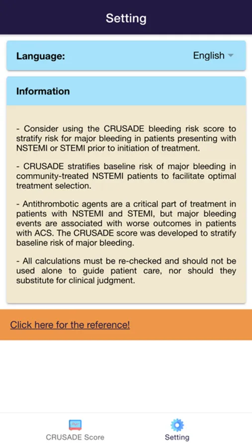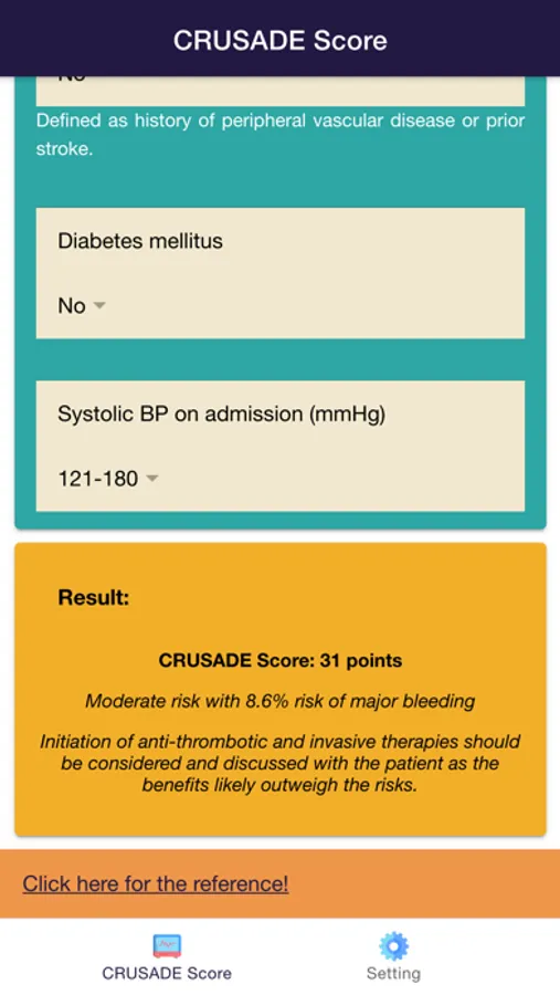 Disclaimer: all calculations must be re-checked and should not be used alone to guide patient care, nor should they substitute for clinical judgment. Calculations in this "CRUSADE Risk Score for ACS: Cardiology Calculator" app might be different with your local practice. Consult to expert doctor whenever necessary.