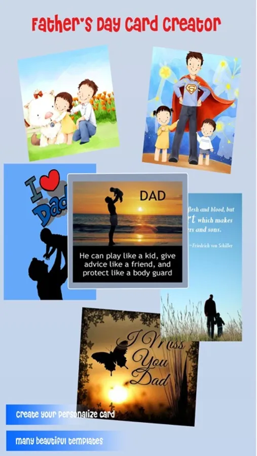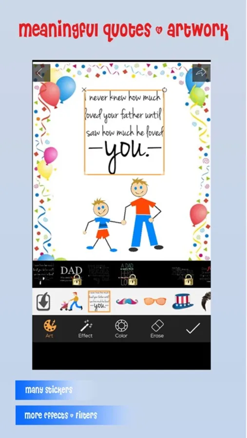 So, let send a PERSONALISED GREETING CARD to your dad in the father's day with many meaningful QUOTES, beautiful TEMPLATES, FRAME, EFFECTS, FILTERS and STICKERS.