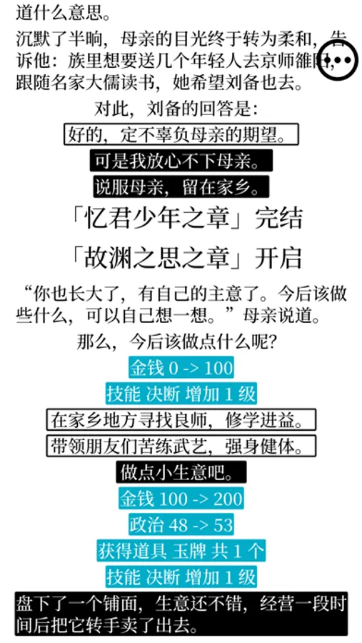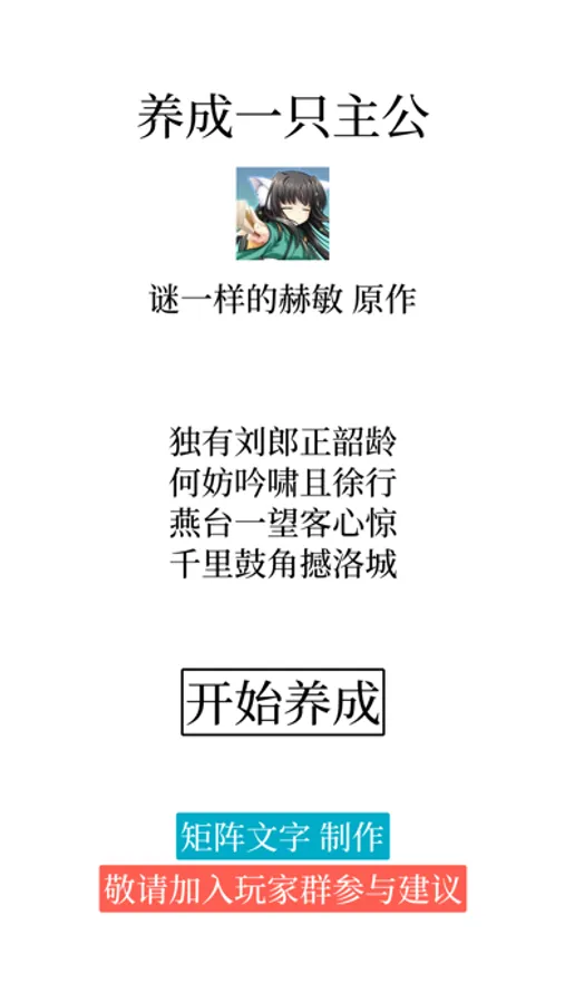 这是一个文字冒险养成游戏,是刘备吧https://tieba.baidu.com/f?kw=%E5%88%98%E5%A4%87吧主【谜一样的赫敏】看了几个同类型的文字游戏后,想写一个以我家主公为主角的游戏而写的。目前写到黄巾之乱结束之后,可能会写很久(应该)。如果不介意她脑洞大、智商低、私货多,愿意有空的时候随手点开看看,那就一起玩吧。