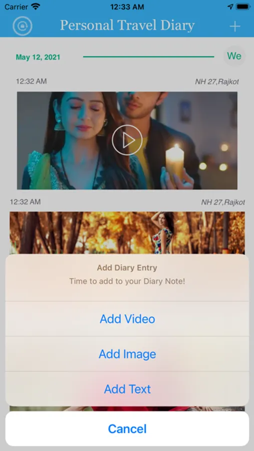 Personal Travel Diary provide add a photo, video, text and also provide take photo and video.
