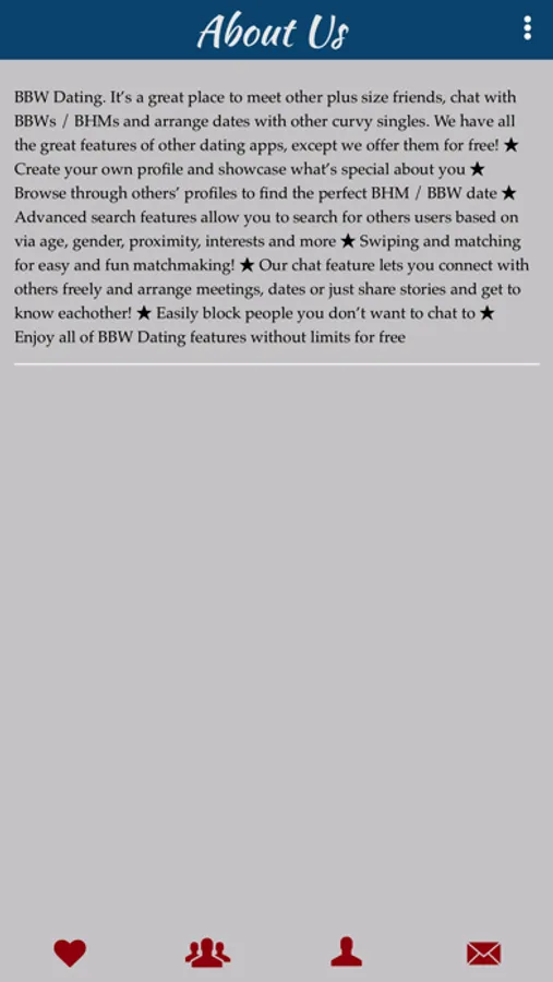 It doesn’t matter whether you’re a BHM, BBW or a lover of larger body types, it’s easy to create an account on BBW Dating and you can enjoy all of the app’s features absolutely free. No restrictions!