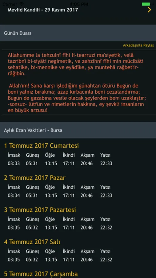 Aylık namaz vakitleri bölümü ise her gün otomatik olarak güncellenip önümüzdeki 30 günün namaz vakitlerini sizlere sunmaktadır.