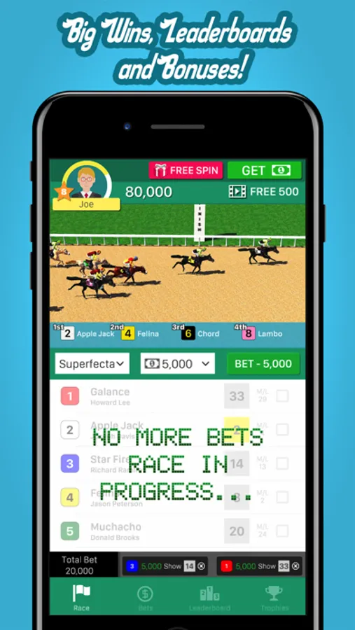 +Variety of simulated bet types: Win, Place, Show, Quinella, Exacta, Trifecta, and Superfecta