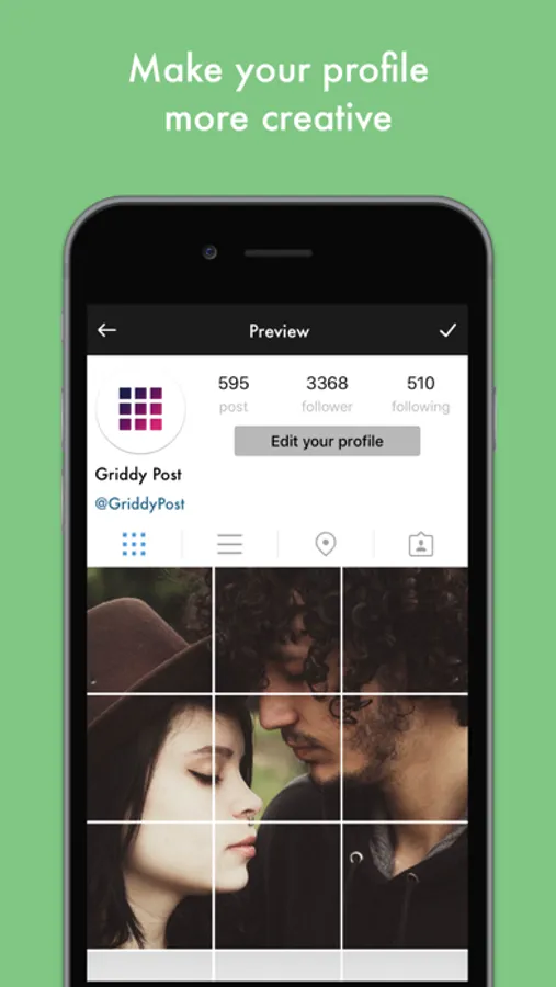 Griddy Post introduces a totally new way of using your Instagram, wrapped in simple and beautiful design. Don't miss the chance to express yourself by embellishing your profile page and posting breathtaking large scale images in their full glory!