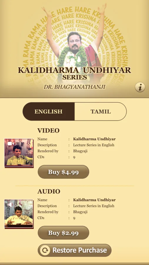This app allows in-app purchases and download of the digital versions (video and audio formats) of Dr Bhagyanathanji’s Kalidharma Undhiyar 9 part Tamil discourse series for offline viewing.