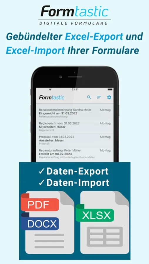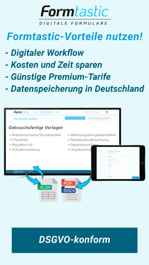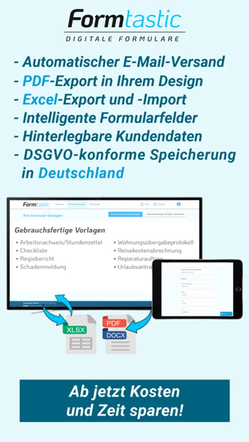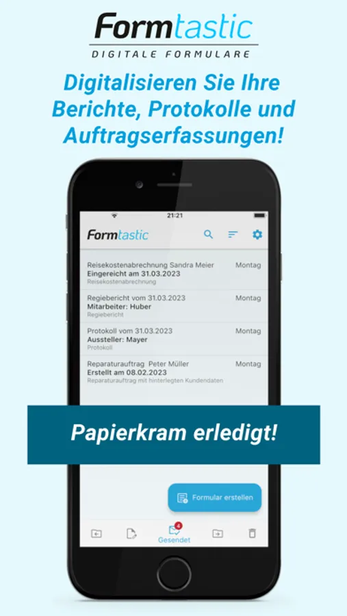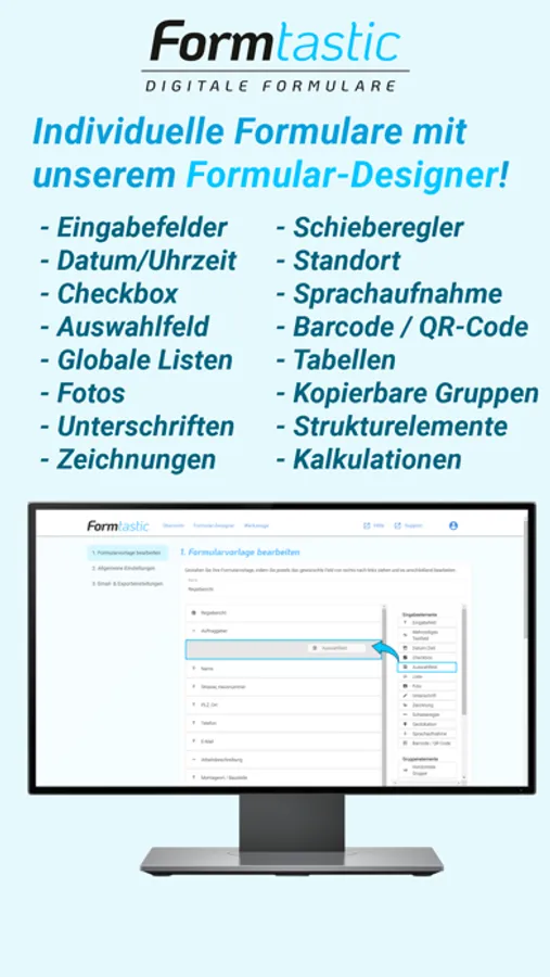 Mit Formtastic können Sie individuell gestaltbare Formulare erstellen und diese über die App ausfüllen. Die erfassten Daten werden automatisch per E-Mail zusammen mit einem PDF-Export in Ihrem individuellen Design versendet. Jedes Papierformulare kann mit dem Formular-Designer in ein digitales Formular umgewandelt werden und dann über die App genutzt werden. Die Formularvorlagen werden einfach per Drag & Drop erstellt. Die erfassten Daten können zur Weiterbearbeitung als Excel-Datei exportiert und auch importiert werden.