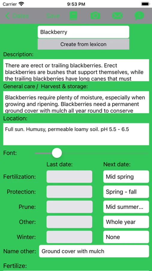 Are you like me? Some plants have to be fertilized or protected from diseases at regular intervals. But when was the last fertilization? My garden diary helps you keep a better overview. In doing so, this app focuses on the most important garden activities like fertilizing, pruning, plant protection. Conveniently create your plants from the built-in encyclopedia, and maintain the dates according to your needs.