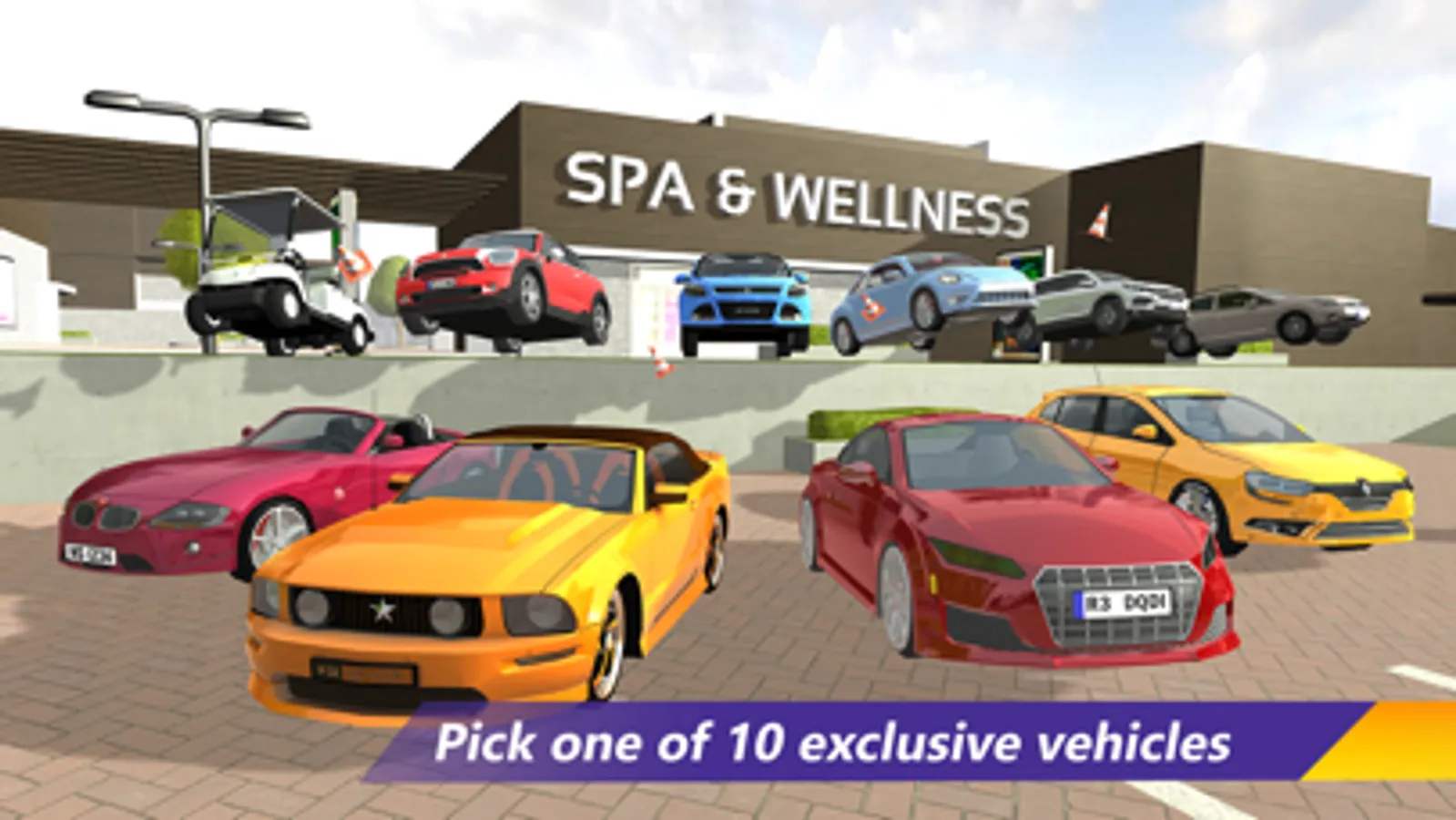Choose from 10 top quality cars. You will get to drive a muscle car, a sports cabrio, an SUV and to make things interesting - even a golf car. Each one controls a bit differently. Learn to get the most of them!