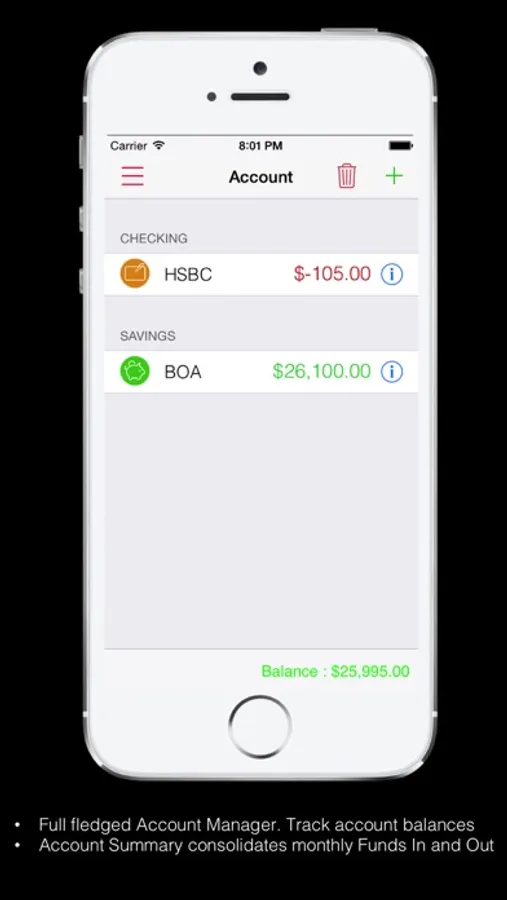 •Setup your Accounts once, and see your account current balances offline anytime based on your transaction data entry either through imports or manual.