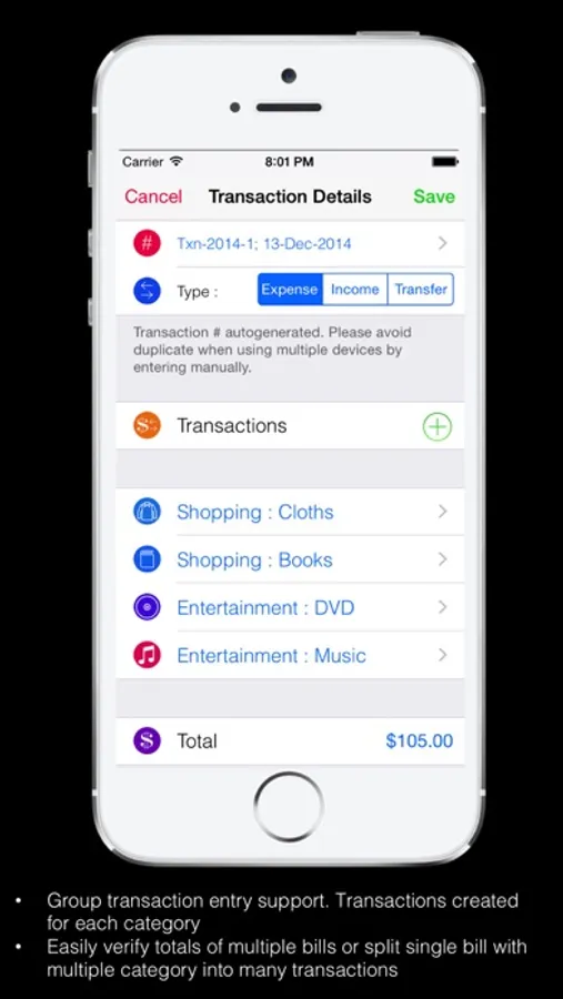 • It supports split transactions into category-wise, and multiple expenses in a group