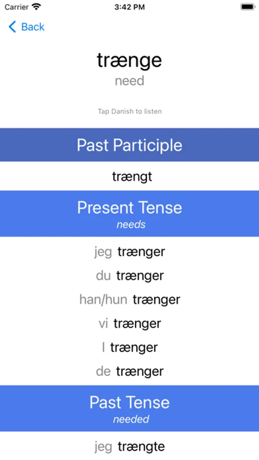 Learn and practise Danish verbs with this interactive verb reference and drill tool. With over 100 core verbs, Danish Verb Blitz is a clear and effective way to refresh and revise your grammar skills as well as expand your everyday vocabulary.
