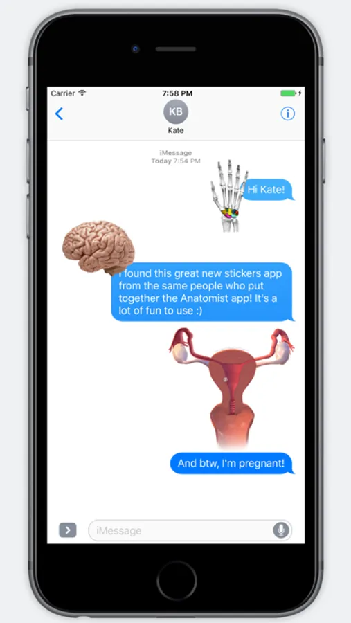 From the makers of the Anatomist app – the #1 anatomy quiz app on the App Store – comes a great new set of 125 anatomy stickers to use in iMessage! Anatomy Stickers is the first stickers app of its kind and is lots of fun to use. Send the images alone in messages to friends, classmates, or colleagues, or stick them to individual messages to add some anatomy fun to your conversations.