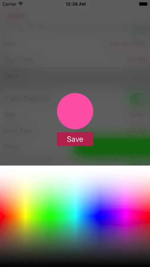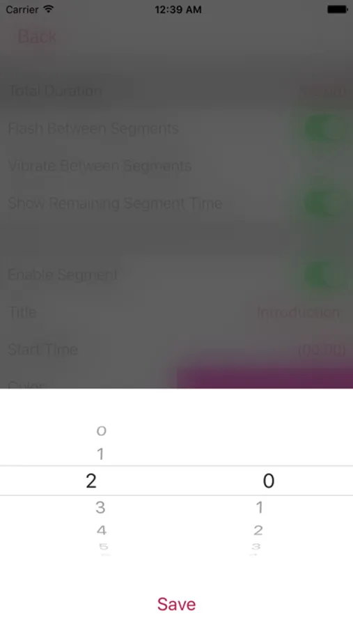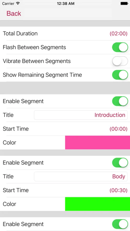 Just head to the application's settings, set the duration of the timer, and divide it into up to 10 different segments. Each segment has a starting time, a color, and an optional title.
