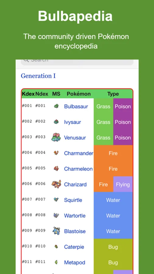 This is the one and only official app for Bulbapedia, the community driven encyclopedia for Pokémon. The app has everything from our wiki. Every guide, every article, every Pokémon fact, it's all here and easily accessible in app form with improved navigation and features.