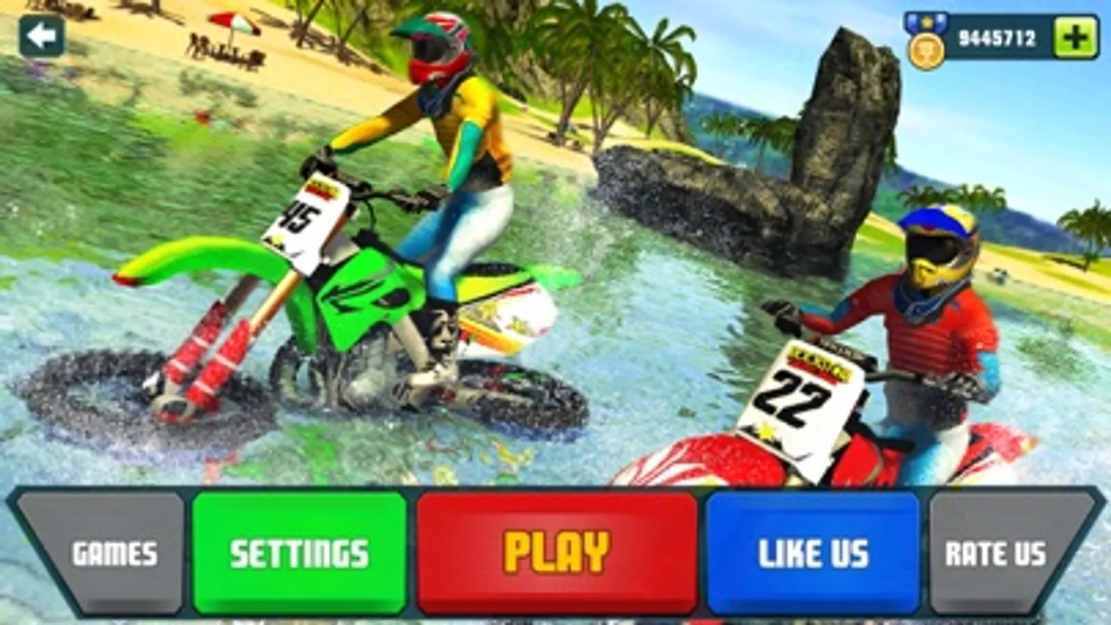 Take control of dirt motorbike to experience real water surfing bike race challenge. On this challenging and dangerous ocean your mission is to win the racing levels by beating all beach surfing motorbike riders. As a bike rider you can drive your bike on the beach as well as on the sea by transforming bike into jet sky like boat. The tyres of bike get transformed into floating tyre once you jump into ocean.