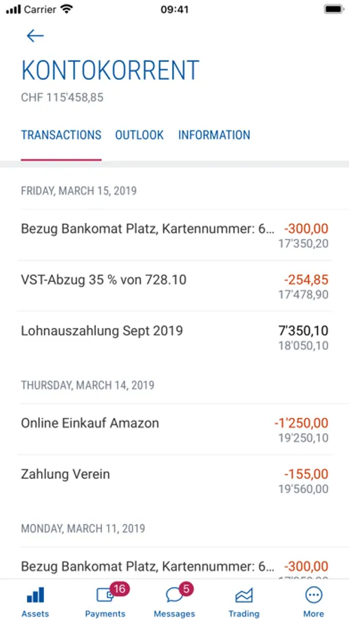 The app gives you an overview at a glance of all the accounts and custody accounts that are activated in your e-banking contract. Account postings and future account movements are also shown, and you can buy and sell securities.
