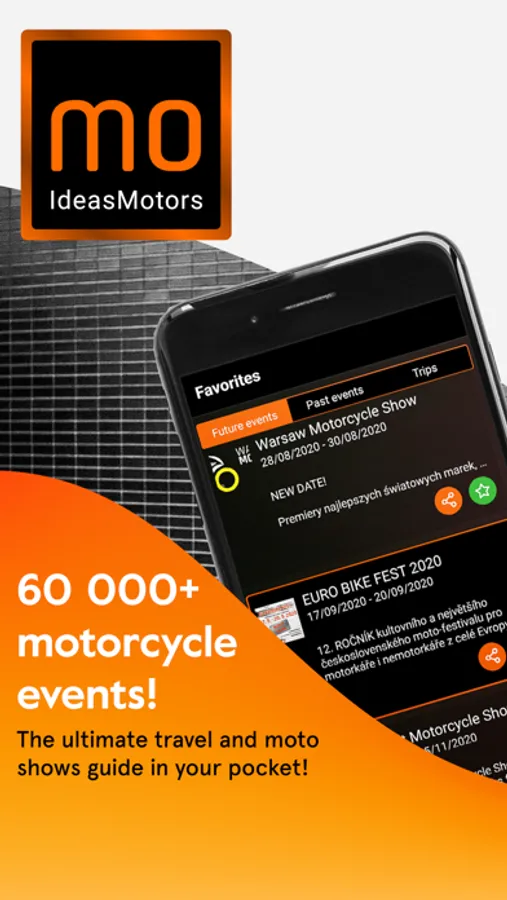 With the IdeasMotors app you will never miss another motorcycle show, bike festival or biker party, because worldwide motorcycle event calendar now is in your pocket!
