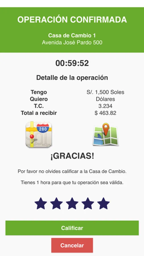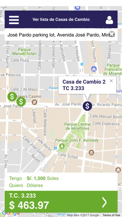 Sólo elije la operación que deseas realizar, tu ubicación, y listo! Tendrás para elegir la Casa de Cambio de tu preferencia dependiendo del tipo de cambio ofrecido, distancia y rating.