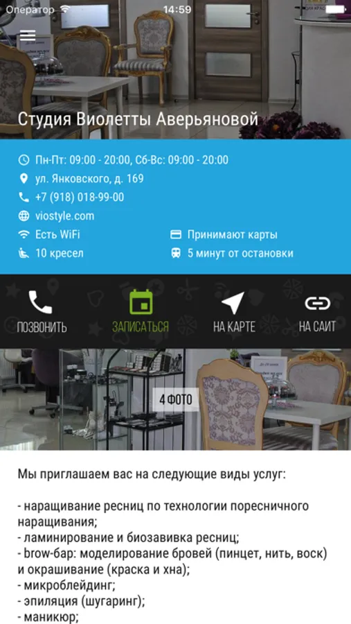 • Просматривать информацию о салоне – режим работы, адрес и телефон, фото интерьера