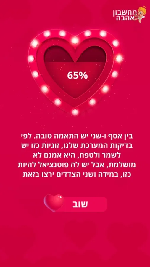 במידה ואם תרצו לברר את בן/ת הזוג האבוד/ה שלכם, תוכלו להוריד בשניות ולבדוק בחינם בעזרת מחשבון האהבה המקצועי שלנו.