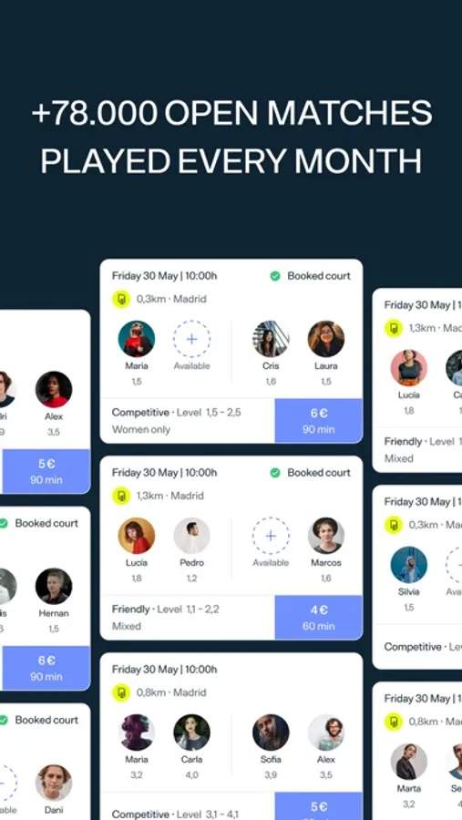 Effectively promote your matches and attract other padel players. Both matches that you create and those that you join will be marked as “Gold Matches”, which will allow other players to easily find them and join in the fun. And to make sure that you always find an available court, we will assign one to you immediately. Pretty cool, no?