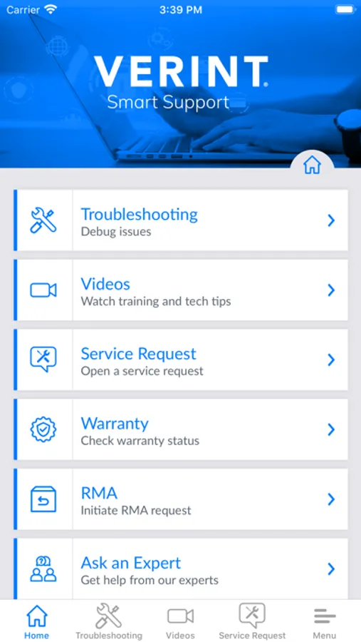 Verint Smart Support™, a mobile application that empowers users to connect with Verint customer service and support 24/7, on-demand from a mobile device. Smart Support delivers the benefit of remote access to support requests, training videos, troubleshooting tips, RMA requests, warranty status, and more.