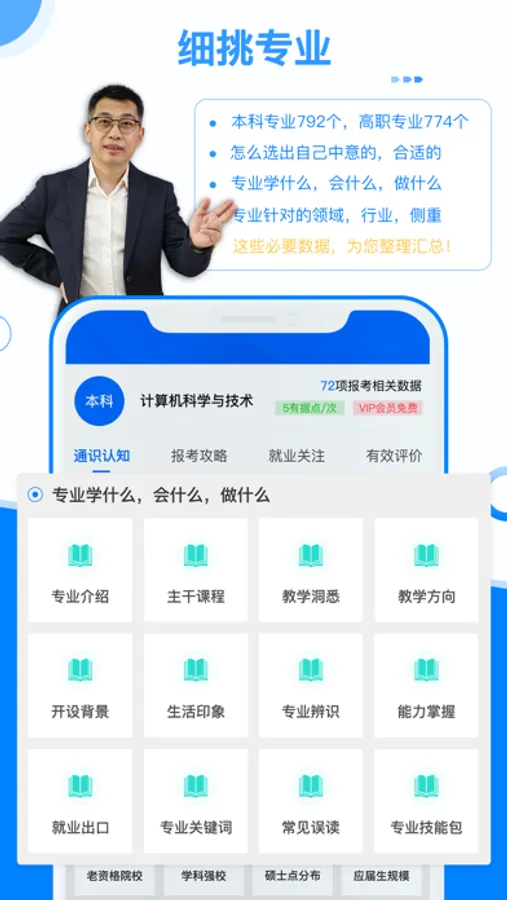 2.【专业详情数据库】提供本科和高职所有专业的数据解析,包含专业通识认知,报考攻略,就业关注,有效评价四个维度,让考生选择专业更有利有据。