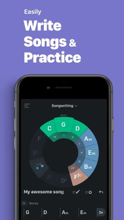 Easily pick chords out of the circle of fifths. Create custom chords, change time signature (4/4, 3/4, 6/8, 7/8, 5/8), change the tempo (40-350bpm), and adjust the flexible song structure.