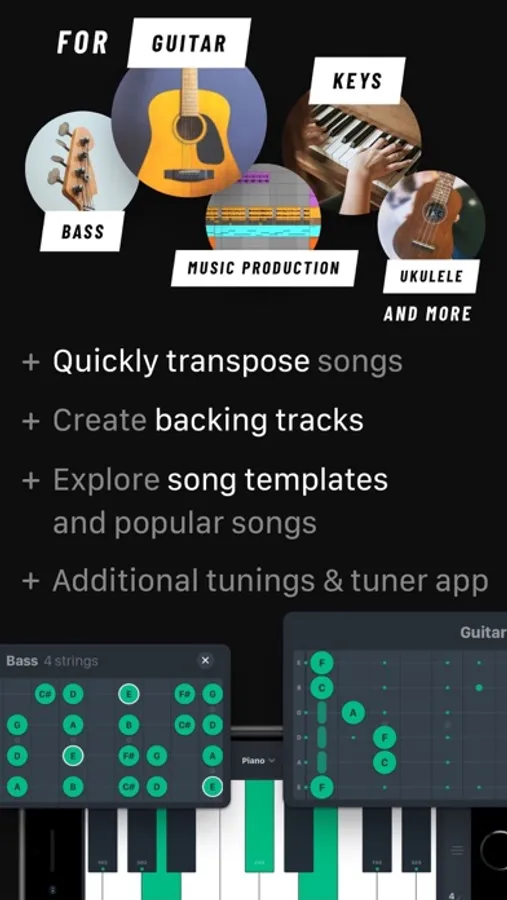 ▶ Integrated instruments: guitar, piano, ukulele, bass, violin, viola, and cello in different tunings.