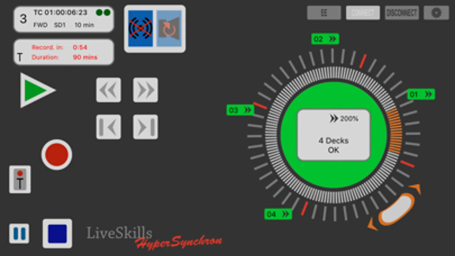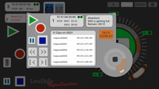 The HyperSynchron Deck Supervisor monitors up to 16 Decks and informs you when an error or a critical situation occurs on one or more Decks, optionally using voice output. Use the innovative Jog/Shuttle tool to control your playback. Setup your decks in the deck popup, format your storage media, set the base file name and see the clips contained on the media storage. Set the record timer to start and finish a recording automatically.