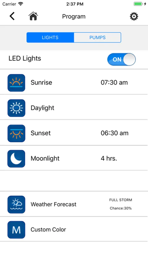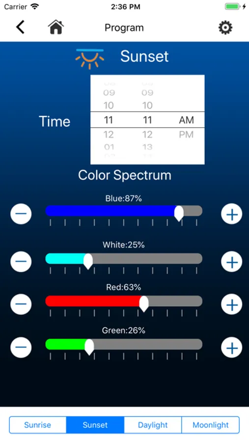 - Program your daily lighting schedule including sunrise, sunset, daytime & lunar colors