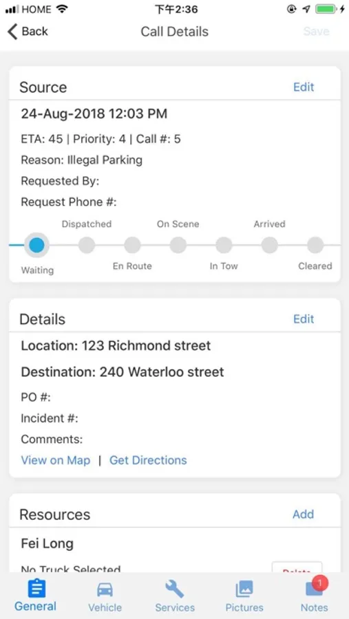 - Retrieve maps and directions for both the location and destination of each call