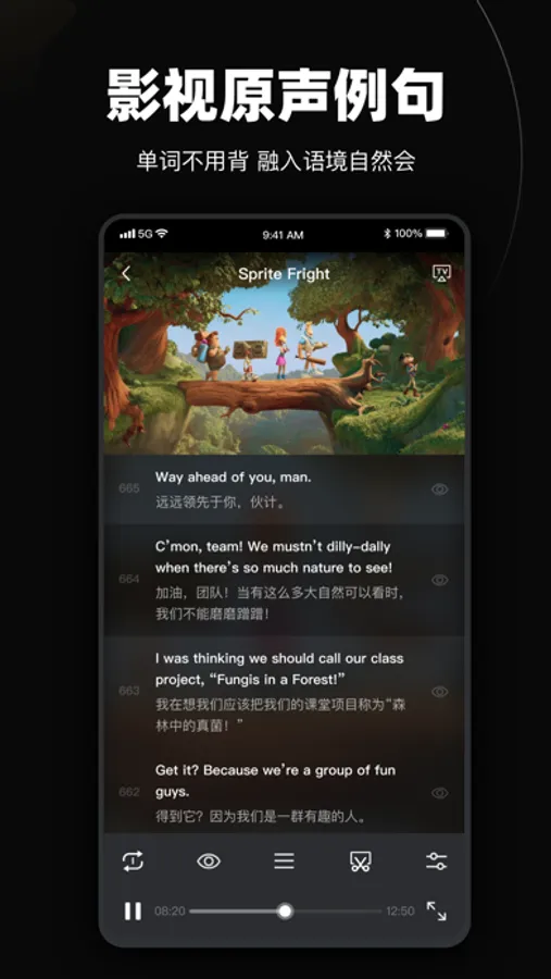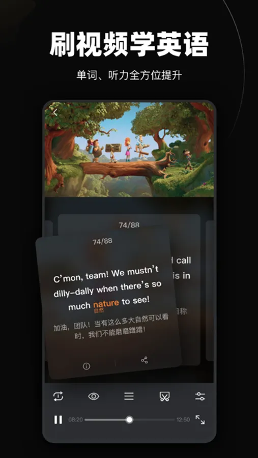 •字幕播放控制:在播放过程中点击字幕列表中的某个字幕即可跳到字幕所在时间点播放,方便反复重听某句台词以练习听力。