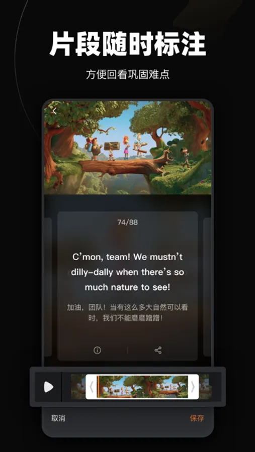 •添加收藏片段:可与根据视频故事情节或者自己的偏好对视频进行分段。分段后您可以反复播放某个片段,也可以在开始学习时直接播放某个片段省去从头快进的烦恼。