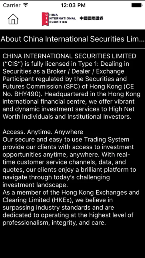 China International Securities Limited (“CIS”) has developed a secure equities trading platform as part of its offering to provide an all-round investment service. Apart from the established phone order and online securities trading system, CIS is now offering a new mobile securities trading app for iOS devices. This new application operates quickly, smoothly and securely, helping you to exploit every investment opportunity, with access to financial markets at your fingertips.