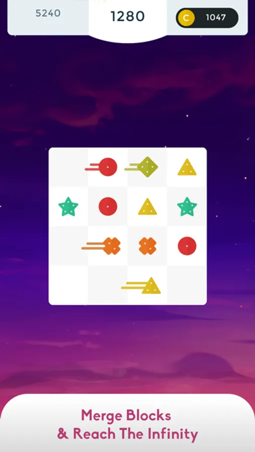 This Merge Game presents you one shape and colour for each combination of dots, where red circles have 1 dot, orange crosses have 2 dots and yellow triangles have 3 dots, etc. All you need to do is to connect the shapes, increasing the count and reaching Infinity.