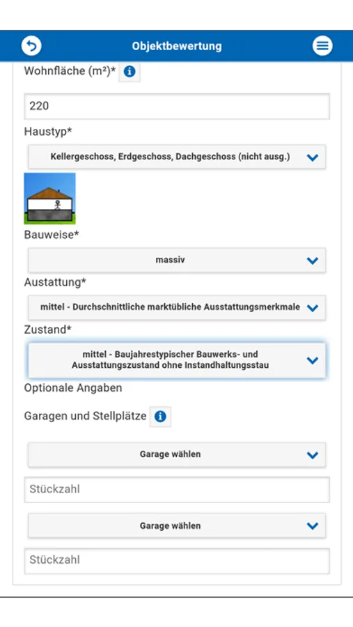 - eine realistische Einschätzung der Ausstattung und des Zustandes anhand eines vorgegebenen Menüs und Hilfebuttons