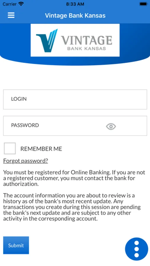 The Vintage Bank KS App from Vintage Bank Kansas allows you to easily and securely access your accounts on the go! With your FREE Vintage Bank KS App you can view balances and transaction history as well as perform funds tranfer and loan payments between Vintage Bank Kansas accounts. You must be a registered Online Banking customer to utilize this App.