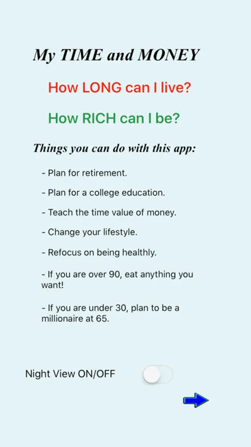How rich do you want to be? This app will tell you how to accomplish your financial goals simply by combining how much you want to sacrifice now and how long you want to save. You will be pleasantly surprised how much money you can put away so you can retire early and in style...and be healthy also.
