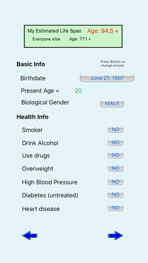 This app estimates your life expectancy based on health and lifestyle questions and gives you a few secrets to living a very long life. You can compare your present situation to the average population to see how your life stacks up so far. And you can change some simple things in your life to greatly improve you chances of living longer.