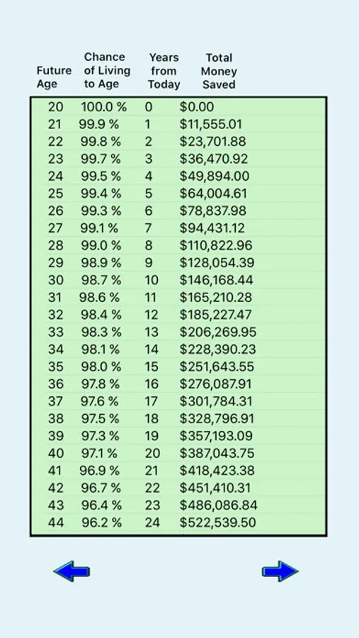 This app will tell you your chances of living to any future age you pick and will tell you how much you have saved at any age.