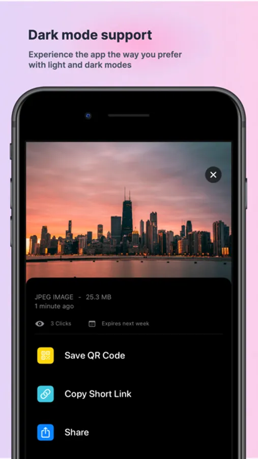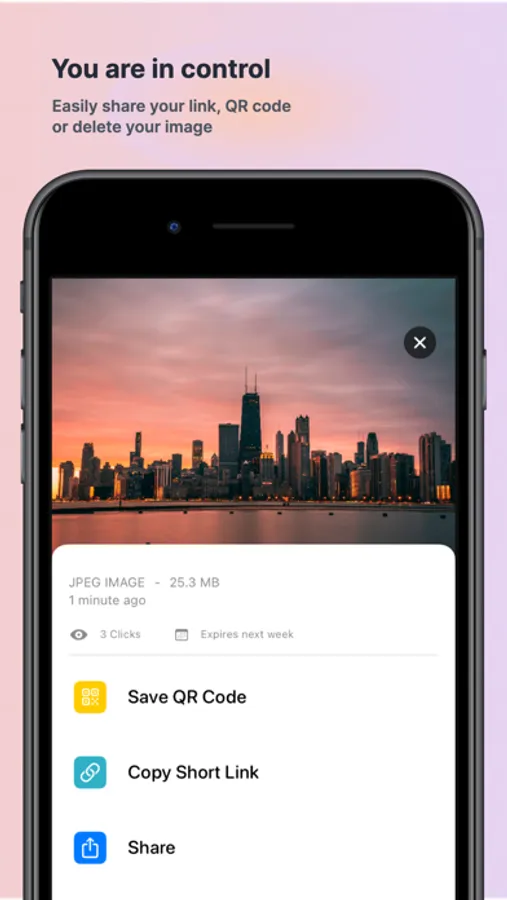 But the convenience doesn't stop there - our app also gives you multiple sharing options to choose from. Use our QR code feature to share your images with anyone, regardless of whether or not they have the app installed. Or, use our short link feature to share your images on any messaging or social media platform, reaching a wider audience.
