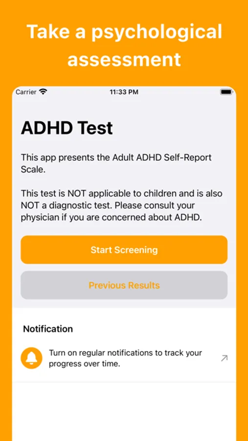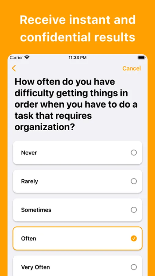 This ADHD Test is designed to help you screen yourself for the possibility of ADHD with eighteen simple questions. This app uses the Adult ADHD Self-Report Scale.
