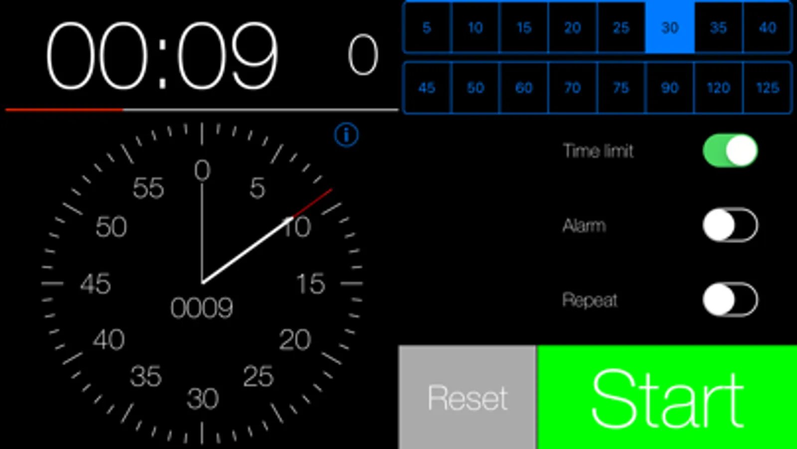 - The repeat function makes it possible to cycle an interval. A cycle count is displayed (The author uses this for a concentration test, where the assessor has to give a prompt every 20 seconds).