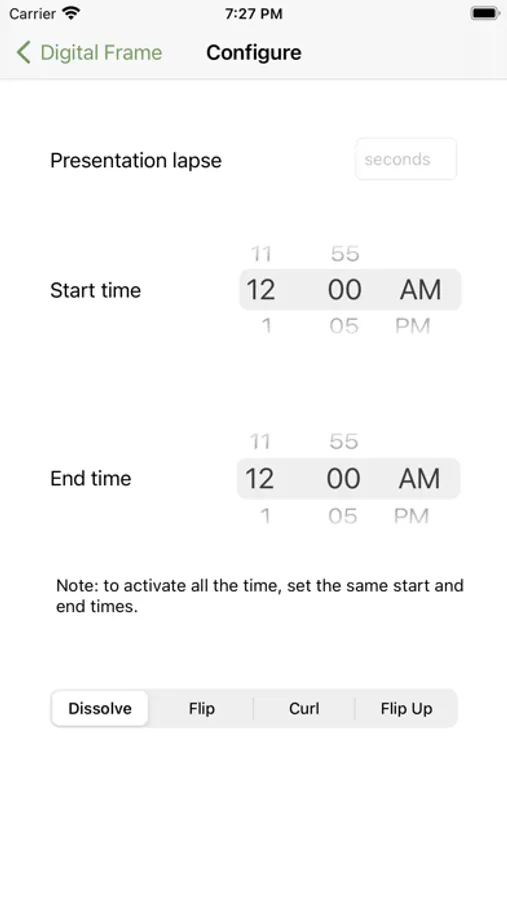 Digital Frame gives a new life to your old iPad or iPhone. A very easy to use app to show randomly all the photos in an album from your Photo Library. Simply select the shared album from the list and slideshow will start. The only thing you must configure are the presentation time of each photo and the start and end times of the presentation.