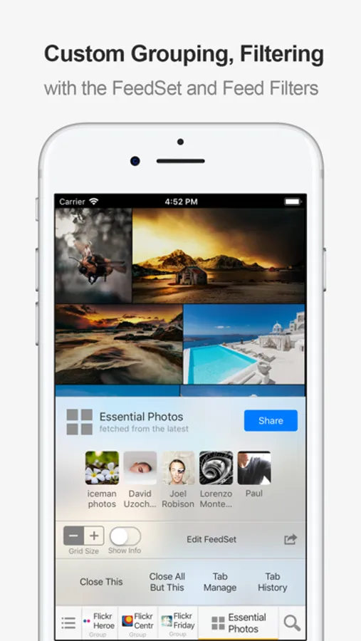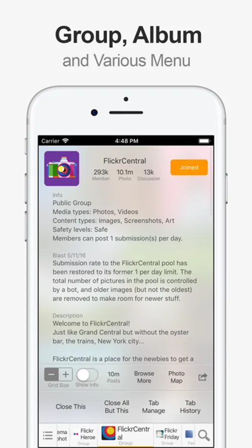 The most powerful way of browsing beautiful Flickr photos: Do you ever need better browser for Flickr photo? Bookmark or quick access to your favorite users and groups? Need a custom grouping? This app's multi-tab feature will be a definitive answer for your Flickr experience.