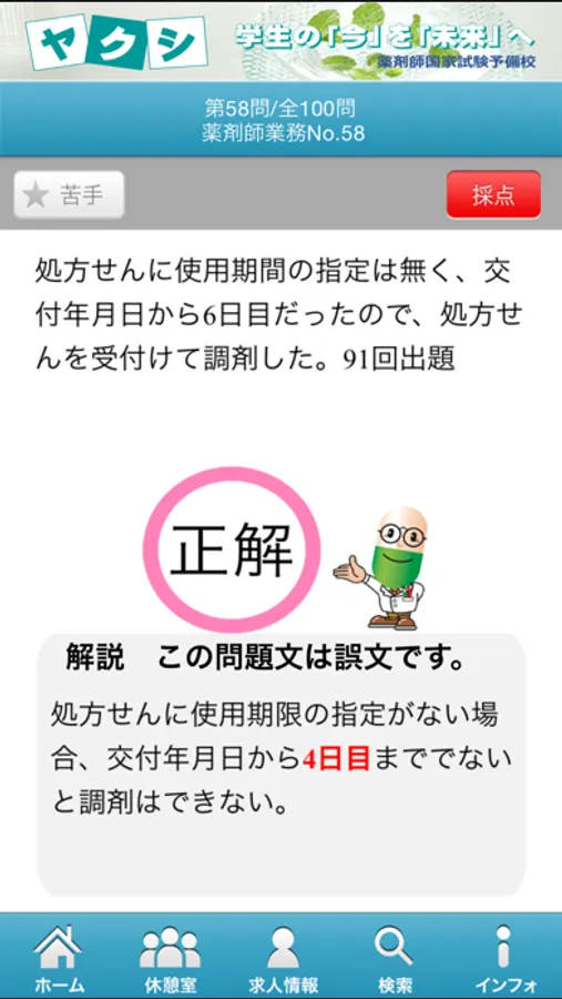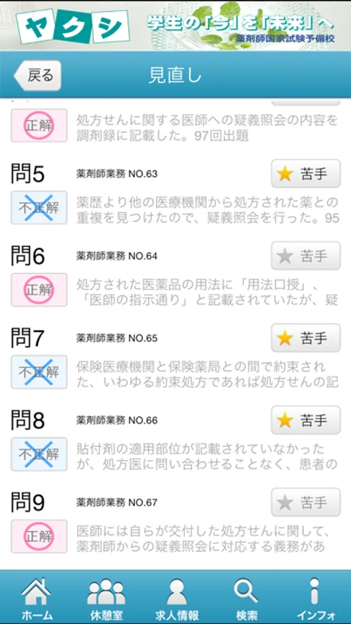 ・「検索」…好きなキーワードを入力して問題を検索できます。(101回、配合注意、投与量…など)