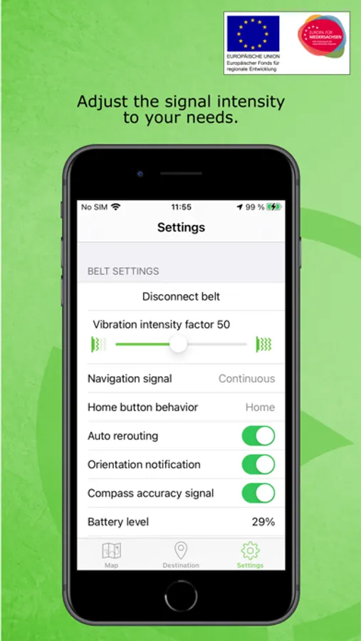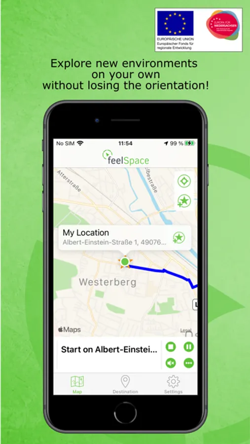 The feelSpace app is a navigation app. It is designed to be used together with the feelSpace naviBelt. The App interfaces with the feelSpace naviBelt via Bluetooth. The naviBelt displays directions through tactile vibration around the waist. Directional information, orientation and navigation cues are intuitively understand in this way. Using tactile directions can help the user focus their eyes and attention on their surroundings during navigation.